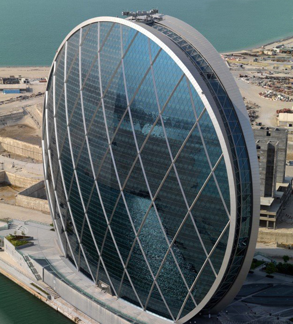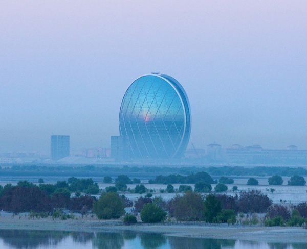 Em Abu Dhabi, capital dos Emirados e muitas vezes apontada como a cidade mais rica do mundo, desponta um prédio de formato totalmente improvável. Ele é redondo, formado por duas conchas de vidro que são unidas por uma estrutura interna. A obra faraônica é sede da empresa de investimentos Aldar.