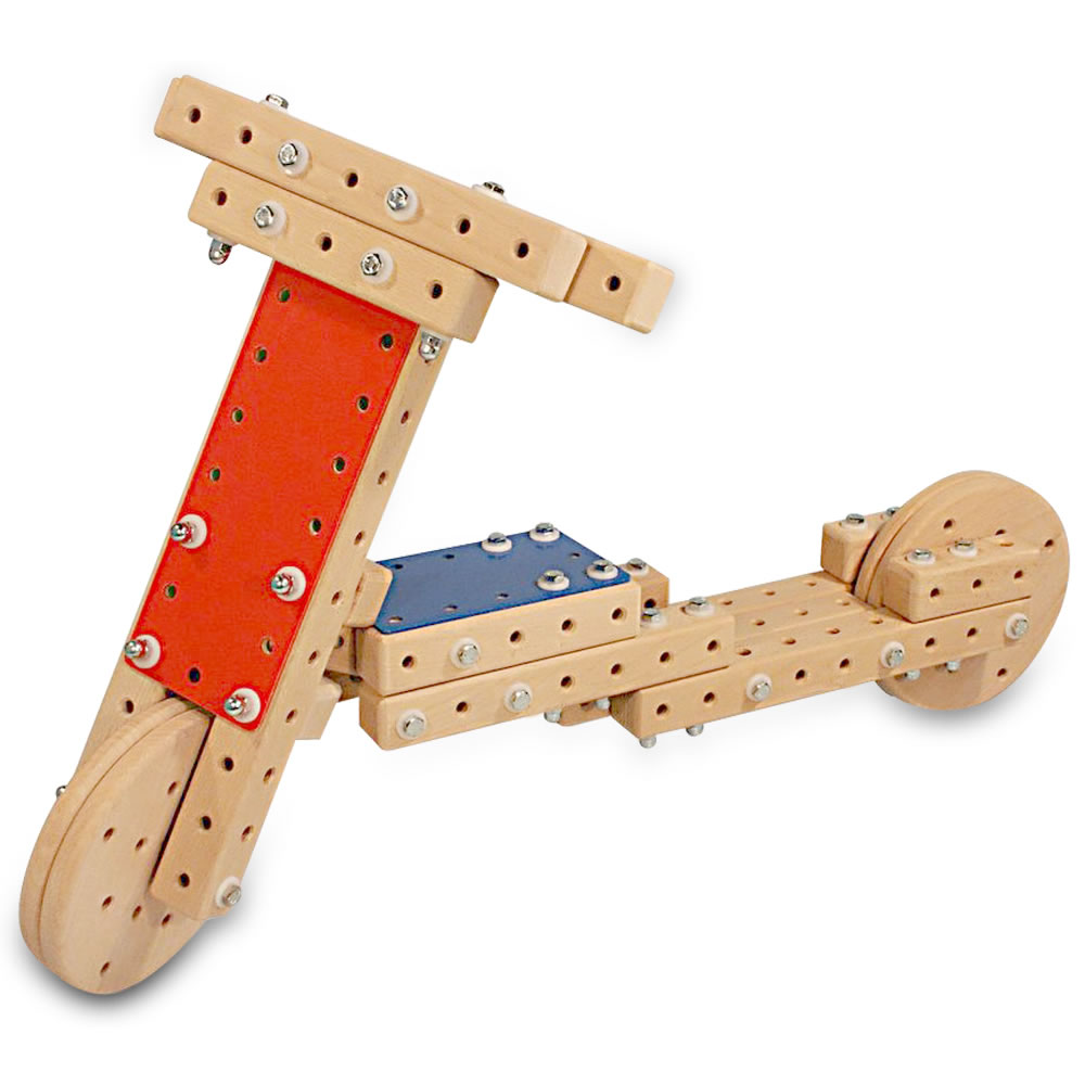 Trata-se de um kit de peças já furadas para o encaixe. São rodas e pinos de madeira, placas estruturais de plástico, cordas e parafusos para conectar tudo isso. De acordo com os vendedores, é possível criar no mínimo 20 veículos com o conjunto.
