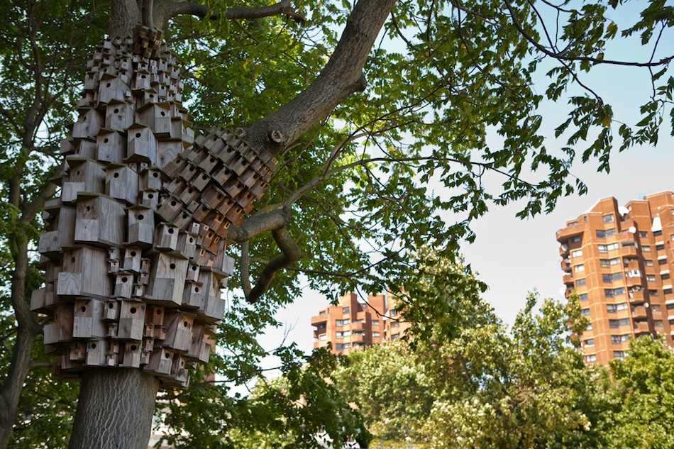 Eles são os responsáveis por intervenções em espaços verdes do centro urbano de Londres nas quais constroem, em troncos de árvores vivas, um tipo de “condomínio” para pássaros. O projeto – intitulado Spontaneous City – relaciona nosso modo de vida urbano com a degradação do meio ambiente e, de modo mais evidente, faz referência à redução da diversidade de pássaros nas grandes cidades.