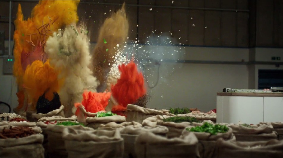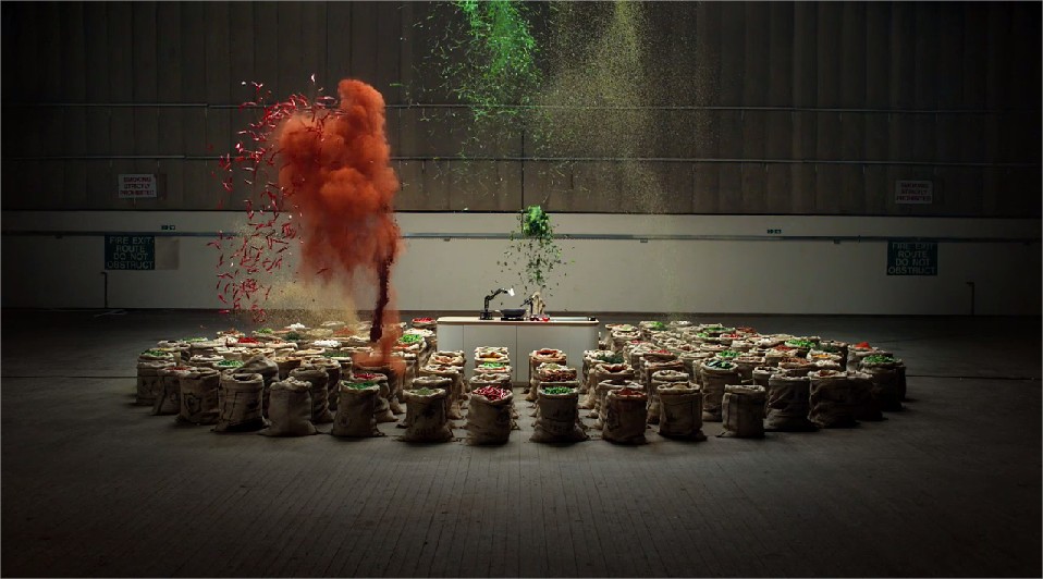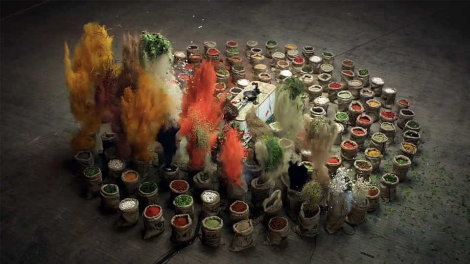 O que você vê voando pelos ares são sacos de pimenta preta, cardamomo, açafrão, páprica, cominho, gengibre, pimenta e coentro. As explosões ocorrem em sincronia com o áudio, cada uma delas representa uma nota ou acorde de piano.