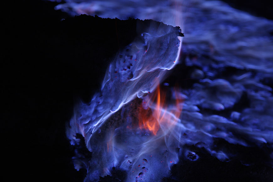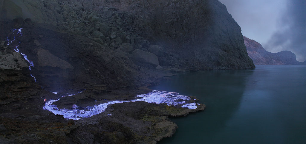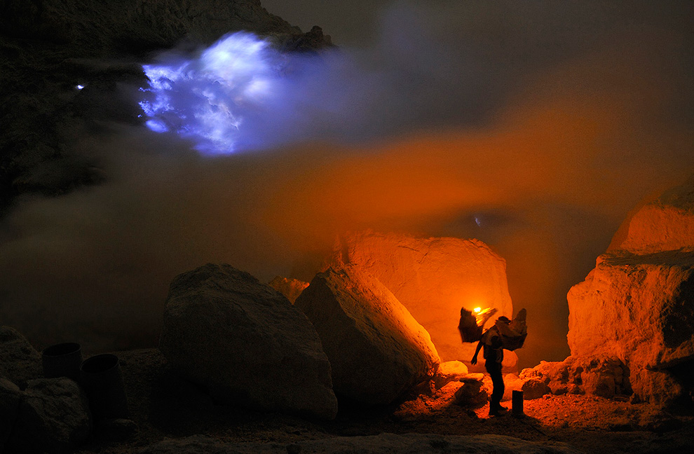 No lugar, funciona uma mina. O que vemos, na verdade, não é propriamente lava, mas sim o enxofre que é liberado pelos trabalhadores locais. Eles aguardam o esfriamento e a solidificação para retirar o componente químico do local. Pedras de enxofre de até 100 quilos são transportadas montanha a cima.