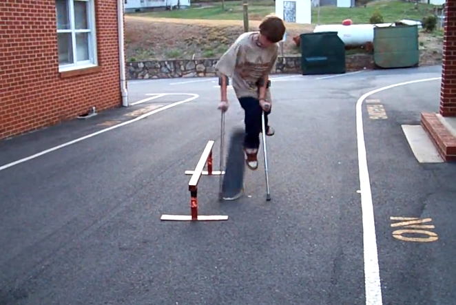 Além de tudo, o rapaz é bastante criativo. Nesse primeiro vídeo, o skate parece decolar sozinho do chão, mas se você reparar bem, ele usa uma das muletas, sobre a borda dianteira, para dar o impulso! Sensacional.