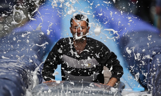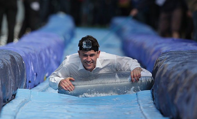 Para uma boa descida, a lona foi encharcada com uma mistura de água e sabão. Cerca de 360 pessoas de sorte – contempladas em um sorteio que contou com mais de 96.000 participantes -, munidas de suas boias, divertiram-se no parque aquático improvisado.