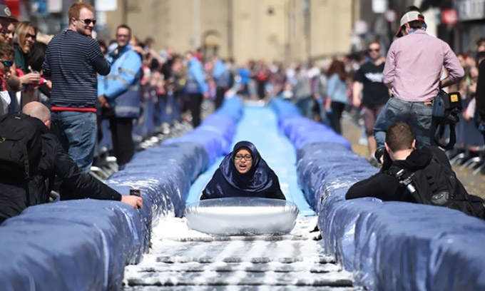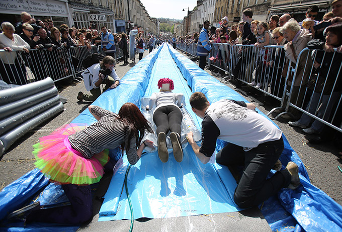 O pessoal de Bristol, Inglaterra, transformou uma das ruas da cidade em um enorme escorregador! Para isso, estenderam uma lona e colocaram laterais infláveis descida abaixo, por cerca de 90 metros.