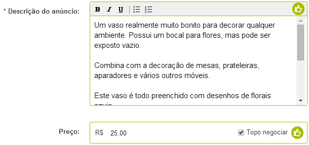 Capriche na descrição e estabeleça um valor. Você pode escolher se aceita ou não negociar!