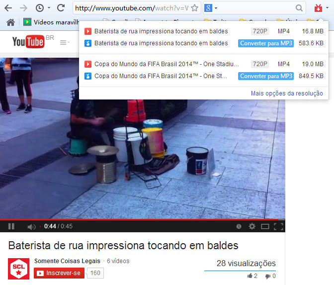 Ao abrir um vídeo no YouTube ou em outros sites semelhantes, o botão de download de vídeos, localizado ao lado da caixa de busca, fica habilitado. Para baixar o conteúdo, basta clicar ali e escolher um formato. É possível, inclusive, optar por baixar um arquivo mp3, dispensando conversões posteriores.