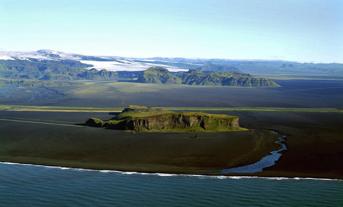 A “Ilha Tuff” (221 m de altura), localizada no sudoeste de Mýrdalssandur, surgiu na Idade do Gelo interglacial e era uma ilha até o século XIV, quando a terra começou a avançar. [via]