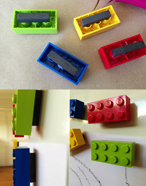 08. Ímã de geladeira de Lego [via] – Com cola quente, fixe um ímã na parte de traz das peças de Lego para transformá-las em ímãs de geladeira (ou de porta-retratos de metal. Aliás, falando em porta-retratos…).