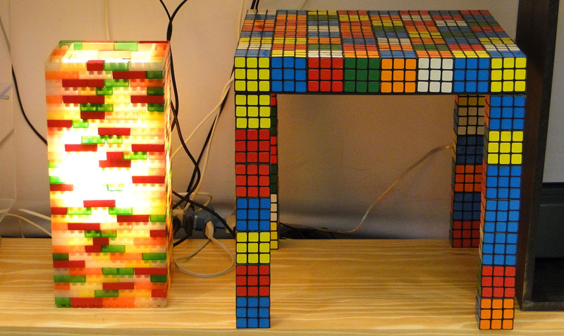 01. Luminária de Lego – Na foto, a luminária aparece à esquerda de uma mesinha feita com cubos mágicos, mas o assunto aqui é Lego! Além da lâmpada, foram usados bloquinhos translúcidos para as laterais do objeto. Criação do designer Pedrazzi.
