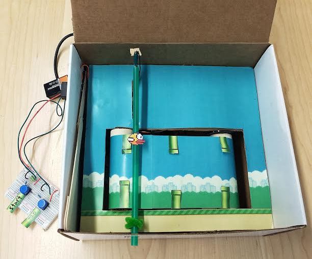 Depois de tantas versões virtuais, Fawn Qiu, fundadora da MakeAnything (comunidade que encoraja o uso de ciência, tecnologia, engenharia e matemática na criação dos mais variados tipos de coisa), trouxe o Flappy Bird ao mundo analógico.