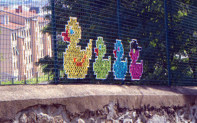 O ponto cruz é famoso em praticamente todo mundo. Daí que na França, o artista Urban X Stitch teve contato com a parada, mas resolveu bordar outra coisa em vez de panos: as grades da cidade de Lyon.